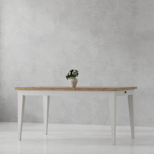 The 60-inch rectangular dining table is a stunning addition to any home. Its fresh hand-painted Cotton finish and contrasting Weathered Natural top offer timeless charm that is sure to impress. The expandable table top accommodates groups of varying sizes, seating up to 6 comfortably and up to 8 with the included 18-inch leaf. The two Captain's drawers are a practical feature that provides ample storage space for dining and entertaining essentials. with dovetail joinery and ball bearing glides, these drawers are both functional and durable. The fashionable apron of the table reflects vintage influences, while the solid-metal custom hardware in authentic Burnished Bronze adds a touch of elegance. The tapered legs create and eye-catching silhouette. Made with Poplar solids and Birch veneers, this table is built to last.