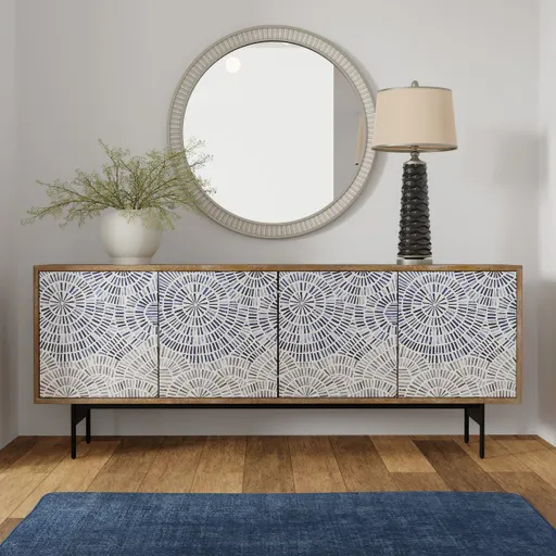 Our handcrafted, solid mango console featuring a stunning mosaic of bone inlay in circular patterns and the colors of sand and sea is a true work of art. This unique design is sure to be the focal point of any room in your home. Crafted from solid mango wood, this console boasts natural variations of color, wood grain and knots, making it a one-of-a-kind piece. Each console is handcrafted by artisans for and authentic, global-inspired character. with four doors that open to reveal two generous storage compartments and removable interior shelves, this console is not only beautiful but also functional. Its multifunctional design allows it to be used as a TV console, buffet, credenza or in any space you need stylish storage. The back panel features slots for ventilation and cord management, making it easy to keep your space clutter-free and organized. Each artisanal piece is unique, so colors and patterns vary slightly based on natural materials, adding to its charm and character. The concealed storage keeps clutter out of sight and the natural variations of color, wood grain and knots make it a unique piece of furniture.
