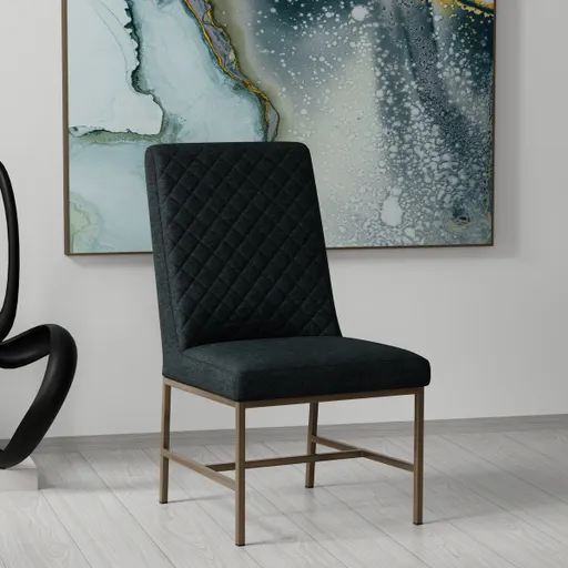 Change things up a bit in the dining room with the instant glamour of this sleek armless dining chair. Effortlessly chic, its straightforward design will complement your favorite dining table. Upscale features like a quilted back and slightly tapered silhouette add a finishing touch. Elegant diamond quilt pattern adds eye-catching allure to this upholstered dining chair. Exquisitely tailored tight seat features plush padding for long-lasting comfort. Upholstered in a polyester velvet fabric designed for elegant everyday living. Metal base wears a hand-applied finish in fashionable Antique Bronze. Wood frame features reinforced corner blocks for lasting strength and stability. Seat and back feature webbed construction for a comfortable seating experience. Quilted back and slightly tapered silhouette.