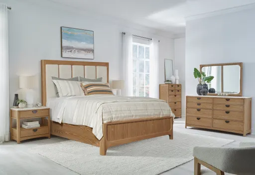 Drift off to sleep in this gorgeous panel bedroom set. Marrying on-trend styling and natural elements, the Panel Bed provides the perfect respite to recharge and refresh at the end of the day. Created with stunning oak veneers over hardwood solids in a light, natural finish Soft, slightly weathered finish with natural patina accentuates the natural oak wood grains Fashionable panel bed design blends wood and upholstered fabric elements for the ultimate in style and comfort Upholstered headboard features contemporary vertical channels in a textured, 100-percent polyester fabric for comfort and durability Upholstered in a high-performance, textured, 100% polyester fabric that compliments any room dÈcor Low-to-the-floor design features a European slat system that doesn't need a mattress foundation Crafted of kiln-dried hardwood for support and longevity