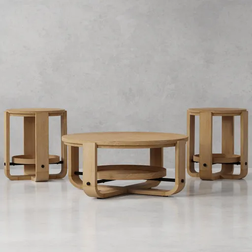 Add the finishing touches to any seating area with this exquisite, multifunctional rolling cocktail table and round end table set. Escape living room table set includes: one cocktail table and two matching end tables Made with oak veneers and rubberwood solids Soft, slightly weathered finish accentuates the natural beauty of the oak wood grains Tables feature a round shelf that sits on black decorative metal bars Designed using substantial legs that end into soft curves at the base Cocktail table has hidden castors which allows for easy movement