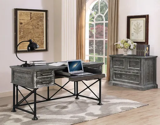 Whether you're working from home or just paying bills, you'll love the distinctive styling of this writing desk. Finished in a handsome Vintage Burnished Smoke paired with a metal-leg base, it features three storage drawers, a center drop-front keyboard drawer, a power center with USB ports, wire access holes for cord management and hidden storage.