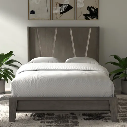 The essence of understated elegance, Pure Modern Bedroom delivers dramatic character with its clean lines and geometric profiles. Signature beds lend fashion-forward sophistication while bold case pieces complement them with stylish functionality. Beautiful wood solids and straight-grain oak veneers are wire-brushed and accentuated by a hand-applied six-step low-sheen Moonstone finish. Eye-catching contemporary bed with streamlined silhouette creates a focal point for any bedroom. Elegantly framed headboard features linear surface designs that glow with integrated touch lighting. Tapered legs create an eye-catching silhouette. Select woods are kiln-dried to minimize warping and splitting while ensuring longevity. Integrated levelers make it easy to level and align your furniture. Premium slat system for long-lasting strength and durability.
