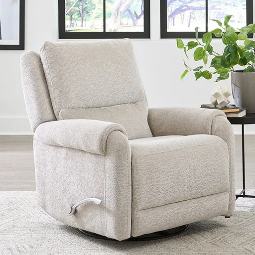 The Gentry recliner is designed for ultimate comfort and style, featuring a 360-degree swivel and a smooth, soundless glide, allowing you to effortlessly find your perfect position. Gentry has rounded curved arms generously wrapped in sumptuous padding and a one-finger manual recline pull that makes adjusting your seating position a breeze.