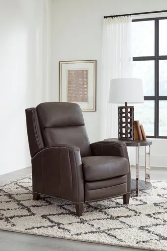 The Vermont power recliner offers a luxurious and effortless power pushback recline feature, allowing you to easily find the most comfortable position for relaxation. It is upholstered in soft leather with custom matching and features decorative nail head stitching detail that adds a touch of elegance. The high-leg design, finished in charcoal wood, not only provides stability but also complements the overall aesthetic.