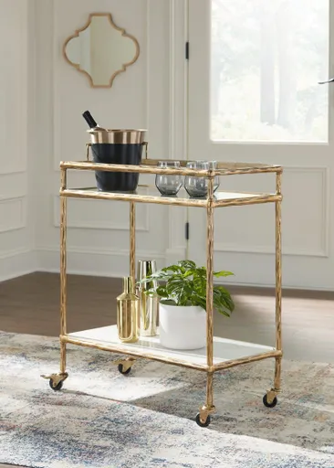 Store and serve in sleek style with this bar cart. Its casually cool design combines an antiqued brass-tone frame with white marble and clear glass. Rails on the top shelf help bottles and shakers stay organized. And with its rolling casters, you can make your at-home mini bar mobile and bring the party where your guests gather. It can also act as a cute coffee station—perfect for storing syrups, mugs and other must-haves for your morning brew.