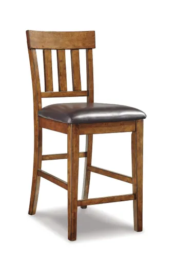 Sleek lines and comfortable cushioning combine to make this upholstered bar stool the favorite seat at the table. Traditional shaker design is given a vintage treatment with the rustic, burnished finish. Faux leather upholstery easily wipes clean. Product Details Assembly required Hand-finished Made of veneers, wood and manmade wood Counter height