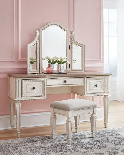 Elevating the art of traditional cottage styling, this 3-piece vanity set is your dream bedroom retreat realized. Its antiqued two-tone aesthetic blends a chipped white with a distressed wood finished top for added charm. Framed drawer fronts and a plushly upholstered stool add refinement, while the tri-panel mirror lends a classic touch.