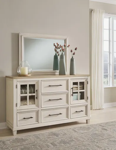 This dresser and mirror set elevates the art of modern farmhouse design. Its two-tone aesthetic blends antiqued white and light grayish brown for a charming finish. Framed drawer fronts and windowpane cabinets lend a country feel. Conveying a feeling of relaxed comfort, this set is sure to carry you away to a dreamy time and place. Made with hardwood solids, veneers and MDF substrates. Two-tone finish (antiqued white and light gray wood tone). Dark bronze-tone bar pulls. 2 glass-front cabinets, each with single storage shelf. 5 drawers with fully finished interior, dovetail construction and heavy duty ball-bearing side glides (top drawer felt lined). Mirror attaches to back of dresser.