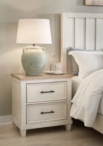 This nightstand elevates the art of modern farmhouse design. Its two-tone aesthetic blends antiqued white and light grayish brown for a charming finish. Two strikingly simple drawers lend a hand with conquering clutter, while AC power and two USB ports provide fast bedside charging. Conveying a feeling of relaxed comfort, the piece is sure to carry you away to a dreamy time and place.
