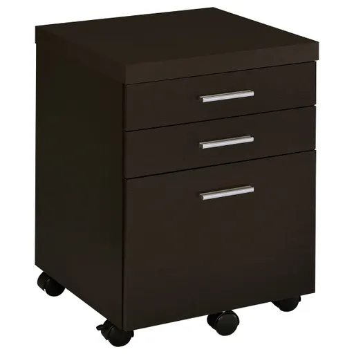 Stay organized in style with this mobile file cabinet, designed for both functionality and modern appeal. Featuring a rich cappuccino finish, this compact storage solution seamlessly blends into any home or office setup. Two spacious drawers and a file compartment provide ample space for documents, supplies, and office essentials. The built-in casters ensure smooth mobility, allowing for effortless repositioning. Sleek silver hardware accents add a contemporary touch, while its durable engineered wood construction ensures lasting use. Key Features: • Sleek mobile file cabinet with a modern cappuccino finish • Two drawers and a file compartment for organized document storage • Designed to accommodate both legal and letter-size files • Smooth-rolling casters provide effortless mobility in any office space • Durable MDF and engineered wood construction for long-lasting use • Sleek silver handles enhance the cabinet’s contemporary design