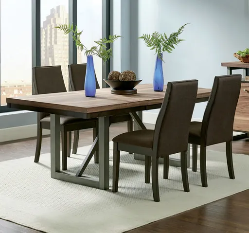 This dining set blends clean lines, natural textures, and everyday functionality for a timeless look. Crafted from solid rubberwood with a warm natural walnut finish, the rectangular dining table features a sappy walnut veneer top and an 18-inch removable extension leaf for added seating. Ergonomically contoured side chairs include padded seats and backs upholstered in soft, durable fabric. With its harmonious balance of simplicity and warmth, this set enhances both casual and formal dining spaces. Key Features: • Five-piece dining set includes a rectangular table and four upholstered chairs • Natural walnut veneer tabletop reveals stunning open grain and wood curls • 18-inch removable extension leaf glides smoothly on metal and wood gears • Chairs feature padded seats and curved backs upholstered in chocolate fabric • Espresso finish frames add depth and contrast to the warm walnut tones • Durable rubberwood and engineered wood ensure lasting support and strength