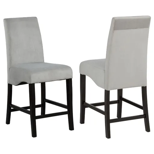 Upgrade your dining space with these elegant counter-height dining chairs. Designed with a classic Parsons silhouette, these chairs feature plush grey velvet upholstery for a soft, luxurious feel. The solid rubberwood frame, finished in deep black, offers durability and a striking contrast. A gently curved seat provides lasting comfort, while a built-in footrest ensures support. Perfectly complementing modern or transitional settings, these chairs add sophistication to any counter-height dining table. Key Features: • Counter-height Parsons chair with a refined and timeless silhouette • Grey velvet upholstery provides a soft, plush, and luxurious feel • Solid rubberwood frame in a deep black finish for durability and style • Gently curved seat enhances comfort for extended dining experiences • Sturdy construction with built-in footrests for added stability and support • Versatile design complements modern and transitional dining spaces