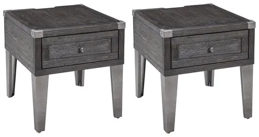 Take a stance for rustic-industrial style with this 2-piece end table set. Weather-washed pine wood and veneers are contrasted with canted metal legs and corner bracket accents for a uniquely chic merger of earthy beauty and contemporary flair. Power plug-ins and USB charging ports mounted on the back add practical function to great form.