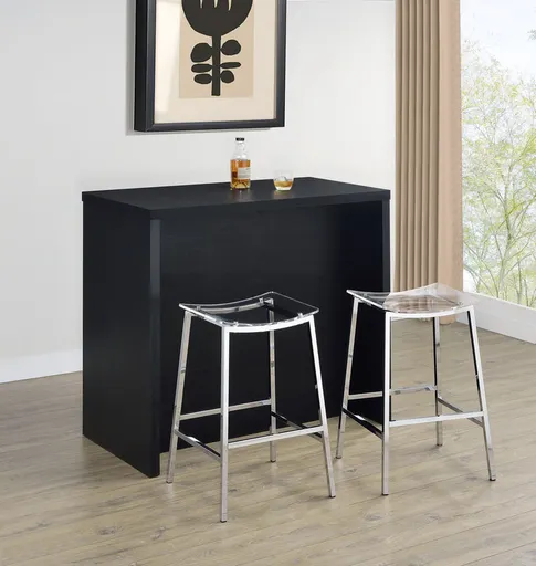This home bar combines modern style with functionality, crafted from engineered wood and laminate veneer for a sleek, durable design. Perfect for entertaining, it features a wine bottle grid that holds up to 12 bottles, multiple open shelves for organization, and integrated metal stemware racks for hanging glasses securely. With its versatile storage solutions and sturdy construction, this bar is an ideal addition to any home, keeping your entertaining essentials stylishly organized and accessible. Key Features: • Home bar in a sleek black finish for a bold, modern look • Crafted from engineered wood and laminate veneer for durability • Wine bottle grid accommodates up to 12 bottles for easy organization • Integrated metal stemware racks provide convenient glass storage • Multiple open shelves offer versatile storage for barware and accessories • Perfect for creating a cozy, functional bar space in your home