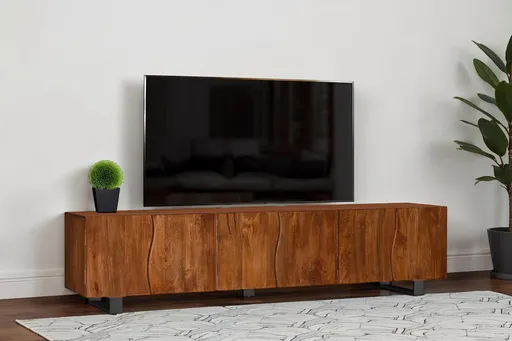 This spacious TV stand is crafted from solid mango wood, offering ample storage with its six doors and adjustable shelves. The mango brown finish highlights the natural beauty of the wood grain, giving it a warm and timeless look. Curved panel details on the doors add a modern touch, while interior shelves provide versatile organization options. Supported by sturdy metal legs, the sideboard blends rustic charm with industrial durability, complete with cable cutouts for media management. Key Features: • Solid mango wood 86-inch TV stand with spacious six-door design • Finished in a rich mango brown that enhances natural wood grain • Curved door panels add a modern and stylish visual accent • Adjustable shelves allow for flexible storage configurations • Sturdy metal legs ensure stability and long-lasting support • Cable management cutouts make it ideal for media organization
