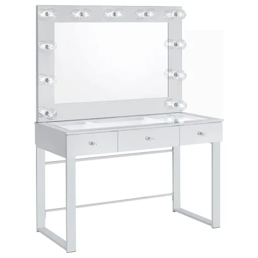 With a Hollywood regency flair, this modern vanity set features a stunning mirror paneled design that reflects surrounding hues. Cleverly designed with a clear tempered glass top that showcases cosmetics and accessories tucked inside the three drawers beneath, this vanity offers a unique functionality. Adorned on each of the three bright white drawers are crystal-like acrylic pulls, further lending to its dramatic glam flair. Mounted on the back is an oversized mirror framed in a mirror-like polished chrome metal finish, complete with a series of retro-inspired, Edison-style LED bulbs. Constructed with a heavy gauge steel base, this vanity set is made to last. Key Features: • Infuse a touch of Hollywood glam with the grand presence of this stunning vanity • Vanity table features a clear tempered glass top and three drawers allowing you to showcase your accessories • Mirror features eleven light sockets for a superior all-around even lighting (light bulbs included) • Metal wrapped mirror frame, drawer fronts, and heavy gauge steel base electroplated and polished in chrome • Constructed with steel, MDF, particle board, glass, and engineered laminate