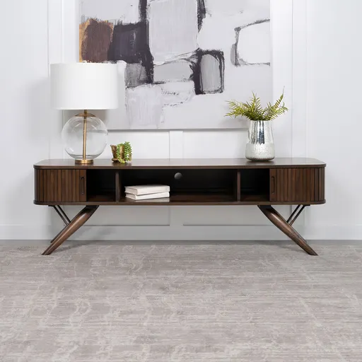 As the centerpiece of any sophisticated living room, this 71" TV stand, with its mid-century modern design, brings a touch of elegance and timeless charm. Its sleek silhouette is perfectly complemented by the rich walnut finish, offering a warm, inviting glow to your space. The cleverly designed sliding doors glide smoothly to reveal or conceal your entertainment gadgets, crafting an immaculate facade that speaks to the minimalist's soul. Designed to accommodate televisions up to 80 inches, this piece isn't just furniture—it's a statement. It stands as a testament to style and functionality, merged into one seamless creation. Key Features: • 71" mid-century modern TV stand • Suitable for TVs up to 80" • Sliding doors for a clean, concealed look • Rich walnut finish adds warmth to décor • Combines elegance with practical design for modern living spaces