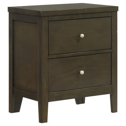 This two-drawer nightstand provides ample storage with a sleek, contemporary design that complements your bedroom’s aesthetic. The deep drawers offer plenty of space for keeping bedside essentials organized, while the dark cocoa finish adds warmth to the piece. Brushed nickel hardware enhances the modern look, providing a subtle contrast against the rich wood tones. Center metal glides ensure smooth drawer operation, while the overall construction promises durability. This nightstand is the perfect combination of style and function for your bedside. Key Features: • Two-drawer nightstand with modern design • Dark cocoa finish adds warmth and sophistication • Deep drawers offer ample storage space • Brushed nickel hardware provides a sleek contrast • Crafted from rubberwood, engineered wood, and okume veneer for durability and style