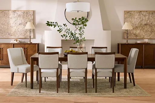 A classic walnut finish adds contemporary charm to any space. Upholstered in an easy-to-clean beige fabric. Fabric content: 100% polyester. Seat height: 19.25" Constructed with hardwood solids and walnut veneers for the perfect balance of durability, livability and lovability.