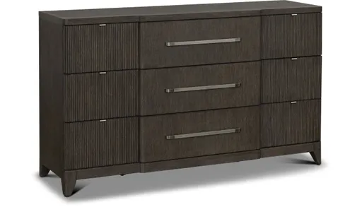 A multi-step finish and vertical reeding adds depth and a contemporary touch to the piece, creating a unique and visually captivating appearance. Available in either a champagne or mocha finish. Zi...