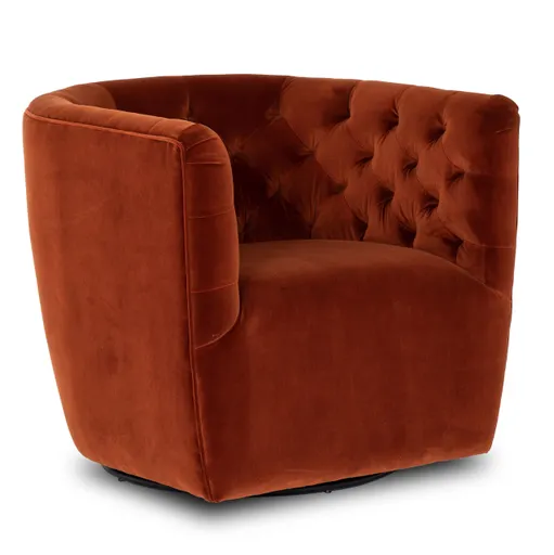 A perfectly curved statement on a swivel. Velvety rust-colored upholstery is pristinely tailored, with dramatic blind tufting and high, shapely arms.