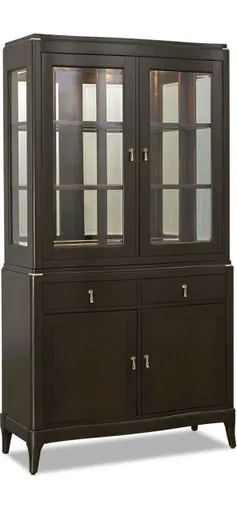 A rich brown finish, walnut inlay, and drop pendant hardware in a light brass finish create a layered, sophisticated look. Two fixed shelves and two adjustable shelves offer an abundance of st...