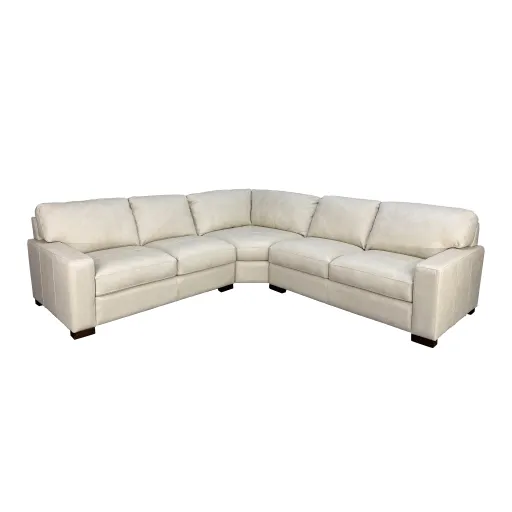 The Wallen 3-piece leather sectional has low wood block feet, block style arms, stitching details and is featured in the 100% Dutton Ivory Italian leather.