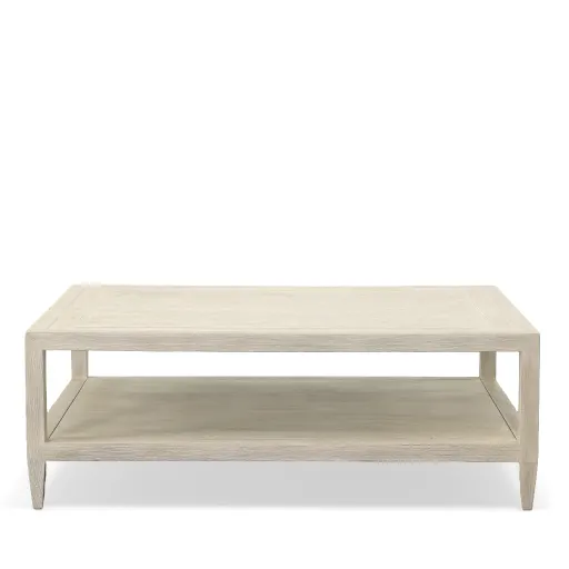 The Dalton cocktail table features a lower open shelf all finished in a white rustic.