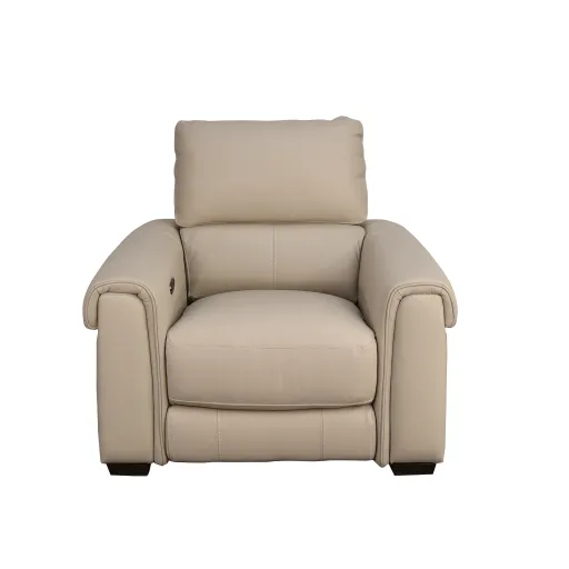 The Zion powered recliner has power headrest, USB-A and USB-C charge port, pillow top arms, block feet, contrasting stitching, and is featured in the Royal Oatmeal leather match upholstery.