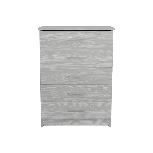 The Aspen 5 drawer chest has grey handle hardware and is shown in the Aspen finish.