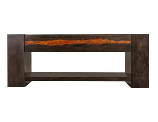 The Raramuri Console beautifully combines artful design and sustainable materials. Each console is crafted from responsibly sourced mango wood, ensuring every piece is unique. This statement piece showcases the wood’s natural beauty and rich tonal variations. Its bold, modern shape is enhanced by a hand-poured epoxy resin inlay and copper mineral accents that gently catch the light, adding both durability and visual interest. Designed to draw attention from every angle, the Raramuri Console is a future heirloom that brings timeless style and the essence of nature into your home.