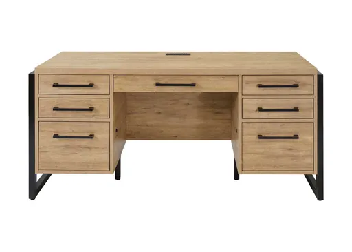 Center storage drawer allows you access your office supplies with ease while leaving plenty of desktop space to work. Four utility storage drawers allow for maximum storage capacity and keeps your desk free from clutter. Two locking file drawers holds hanging files to keep papers organized and secure. Heavy-duty, ball bearing drawer slides allow drawers to open and close all the way with quiet and smooth movement. Power center with 3 USB and 2 AC outlets allows for multiple devices to be plugged in with ease. High quality thermal fused laminate construction for durability and long lasting use.