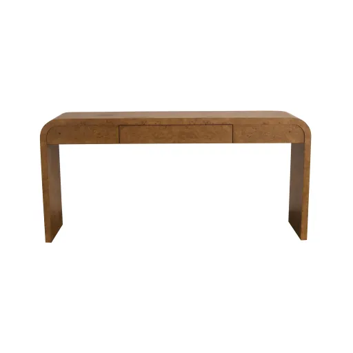 The Mado console table has one small drawer and is featured in a solid oak wood with oak burl veneer with a dark matte finish.