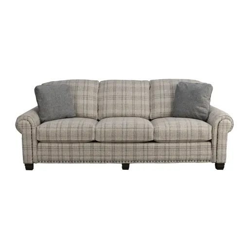 The Anise XL sofa has black pearl nail head trim, large, rolled arms, removeable cushions, wooded legs in the Mocha finish, decorative accent pillows and is featured in a plaid style cream-colored fabric.