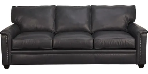 The Warren sofa has curved arms with black nickel nail head trim, tapered short wood legs and is featured in 100% leather with the Along Shale colorway.