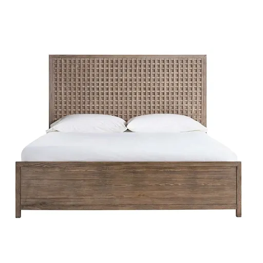The Boulder Panel Bed makes a striking statement with its architectural latticework headboard, rendered in a warm Boulder medium-brown finish. This bed blends natural texture with clean, modern lines, creating a focal point that is both sophisticated and inviting. The solid panel footboard and side rails complement the intricate headboard, offering a harmonious balance of design and comfort.