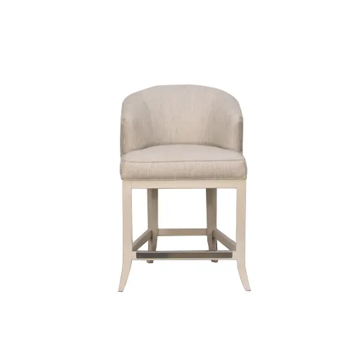 The MIY counter stool is a barrel style chair with Index Porcelain fabric seat, a wood flare base in the Casablanca Finish and a nickel kickplate.