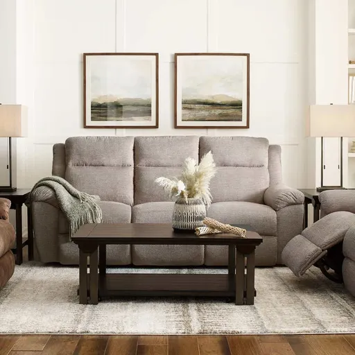 The Joel Power Reclining Sofa with Headrest features flared arms, lush cushions and comfy, casual style. Pillowy arms welcome you, then press the button to adjust the backs, headrests, chaise seats and legrests—your tv binging just went next-level!
