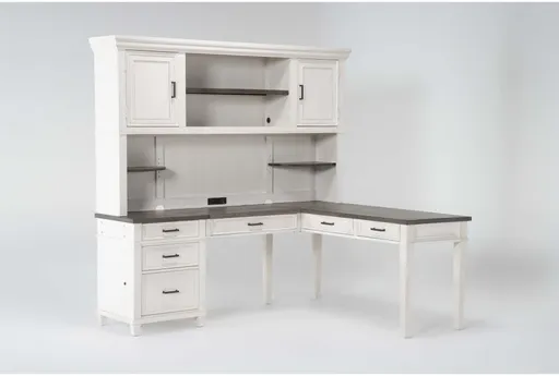 The Aberdeen 4 Piece Wood Modular L-Shaped Desk With Hutch brings farmhouse character and sensible organization to your home office. Finished in white with subtle ivory accents, this modular computer desk features a right-facing l-shaped layout that supports multitasking and a dedicated return for secondary tasks. A roomy hutch with adjustable shelving, multiple storage drawers and a storage door keep paperwork and reference materials organized while integrated AC outlets and a pull-out keyboard tray simplify your tech setup. This office desk balances practical storage and a generous work surface so you can focus on writing, meetings or creative projects without clutter.