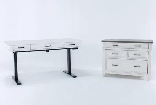 The Aberdeen 2 Piece Office Set Adjustable Standing Desk + Filing Cabinet brings farmhouse character and modern functionality to home workspaces with a matte white finish and subtle ivory option. A height adjustable standing desk provides a large rectangular work surface for computer work, writing and surface display while the matching three drawer cabinet keeps files and supplies organized. Metal accents and oak, birch and eucalyptus veneers pair with selected solid hardwood elements for visual warmth and everyday durability. Built with metal drawer glides and integrated AC power outlets, this set supports busy remote workdays and study sessions.