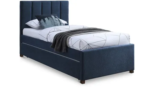 Adair is a navy twin, channel tufted upholstered platform bed with a pull-out twin trundle that expands sleeping capacity without taking up extra floor space. Its vertical channel tufting and fluted panel details create a mid-century modern silhouette while the padded headboard provides a comfortable backrest for reading or homework. The bed is upholstered in polyester fabric over foam padding and a reinforced wood frame, and a slatted platform gives mattress support without the need for a box spring. Designed as a small space solution for dorms, kids rooms and guest areas, Adair blends modern bedroom furniture style with practical overnight accommodations.