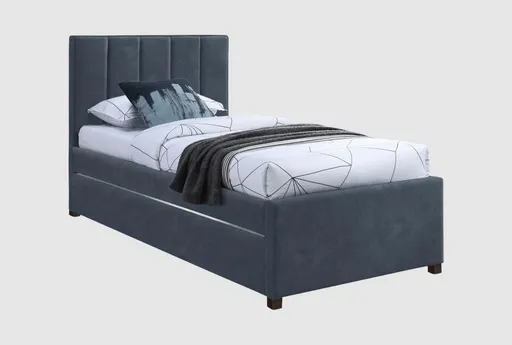 Adair Navy Twin Vegan Leather Channel Tufted Upholstered Platform Bed With Pull-Out Twin Trundle brings tailored comfort and smart sleeping flexibility to a kid's or guest room. Upholstered in navy vegan leather with vertical channel tufting, the headboard has foam-filled padding for cloud-like support while keeping maintenance simple. The frame is built with MDF and particleboard and rests on a sturdy platform base so no box spring is needed. A pull-out twin trundle rolls out on casters to add a second bed when needed and tucks away to save floor space. Thoughtful construction and modern proportions make this bed a practical, design-forward choice for growing spaces.