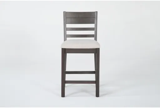 Experience the perfect blend of style and comfort with the Adonis Grey Wood Back Upholstered Seat 25" Counter Height Stool. This armless ladderback stool is designed to fit seamlessly into your dining room or kitchen. Its medium grey finish and wood construction make it a versatile addition to any casual setting. Crafted from durable rubberwood with veneer and MDF. Comfortable upholstered seat for extended sitting. Perfect counter height for kitchen and dining spaces.