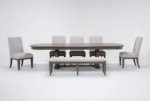 The Adriana 88-124" Extendable Oval Rectangular Grey Wood Trestle Dining Set is perfect for your dining room or kitchen. This set includes a bench and side chairs, providing seating for up to eight guests. The ash grey finish and traditional style create a timeless look that complements any decor.