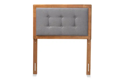 The Adryan Twin Dark Grey Natural Fabric Upholstered and Walnut Brown Finish Wood Headboard adds a touch of mid-century modern charm to any bedroom. Its tufted detailing and dark grey fabric create a sophisticated look, while the walnut brown finish wood frame offers a warm, natural accent. Ideal for kids' rooms or guest bedrooms, this headboard combines style and comfort effortlessly.