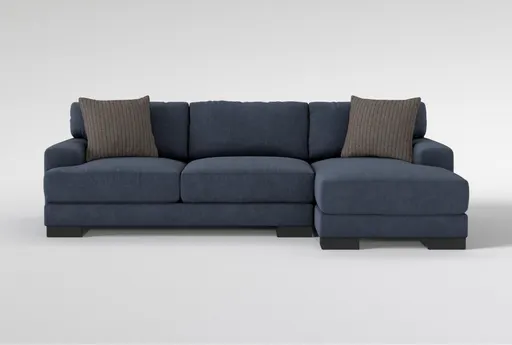 Aidan VI brings modern modular living to larger rooms with a two-piece, right facing 111 inch sectional upholstered in a polyester-blend performance fabric in blue with a natural block base. Deep-seated foam cushions and loose, reversible back cushions create a plush yet supportive seat that welcomes long movie nights and family gatherings. The right-facing chaise is reversible for flexible layouts and the slim track arms and low block legs give the sectional a clean, modern silhouette that pairs well with contemporary and mid-century modern schemes. Built for everyday life, the performance fabric is stain resistant and easy to spot clean, making this a practical choice among modern living room furniture.