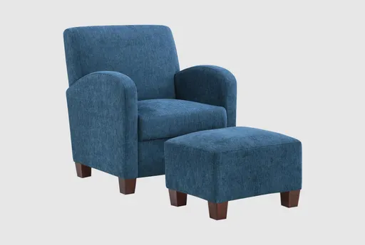 Introducing the Aiden Navy Blue Fabric Herringbone Arm Chair & Ottoman Set, perfect for adding a touch of modern style to your living room or bedroom. This set features a firm comfort level and is upholstered in 100% polyester high performance fabric, ensuring durability and ease of care. The eco-friendly design includes supportive arms and a tight back for added comfort.