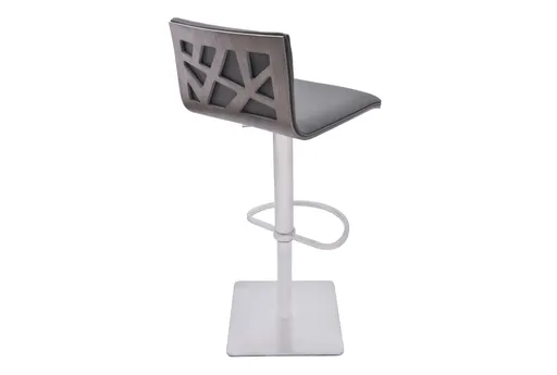 Aleks 31" Grey Faux Leather And Grey Walnut Adjustable Height Swivel Barstool With Brushed Stainless Steel Base pairs a grey faux leather seat with a grey walnut wood veneer back and a brushed stainless steel base for a modern dining-room look. The adjustable height and 360-degree swivel make transitions between counter and bar seating effortless, while the integrated footrest keeps you comfortable during long conversations. Its compact square base and neutral tones help the barstool fit kitchens, islands, or casual dining areas without taking up visual space.