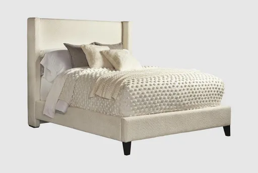 The Alena Bed brings modern form and practical comfort to the bedroom with a tall wingback shelter headboard upholstered in high-performance fabric. The headboard features vertical channel tufting over a foam core with dacron wrapped foam for a cushioned feel that supports head and neck when reading or watching TV in bed. As a platform bed, Alena provides stable mattress support and is adjustable base compatible so you can customize sleep position without extra foundations. The ivory performance fabric and neutral profile make this queen bed a refined choice for modern bedroom furniture and a small space solution.